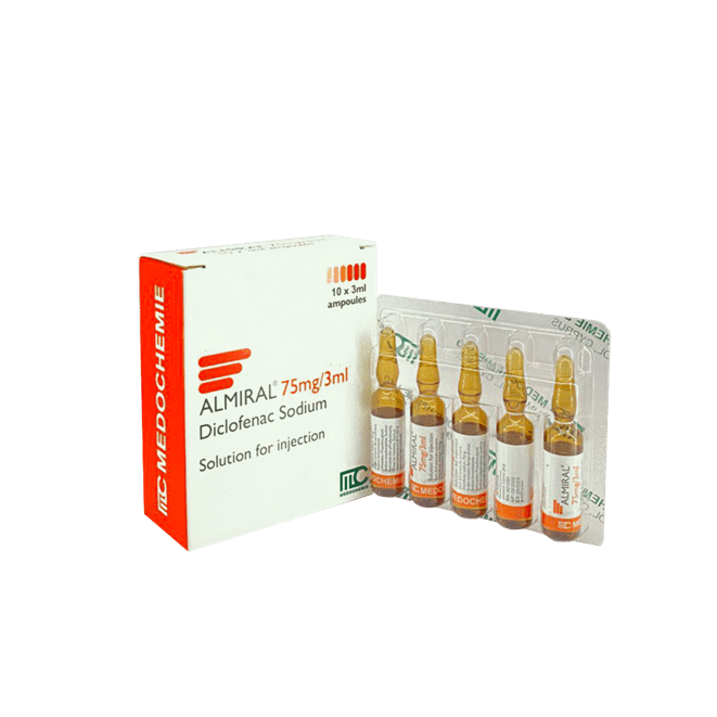Almiral 75mg هو دواء يحتوي على Diclofenac Sodium، ويُستخدم من أجل تسكين الألم وتقليل الالتهاب في حالات متعددة مثل آلام العضلات، التهاب المفاصل، الإصابات الرياضية، وألم الظهر. يتم إعطاؤه على شكل حقن عضلية لتأثير سريع في الحالات الحادة.