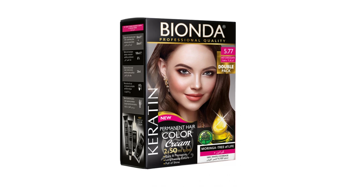 صبغة الشعر Bionda Keratin Hair Color Tube 2 Pcs Shade 5.77 من بيوندا تمنحك لونًا غنيًا وعصريًا بدرجة بني كابتشينو فاتح مكثف (5.77) لإطلالة أنيقة ومتألقة. بالإضافة إلى ذلك، تحتوي تركيبتها على الكيراتين الذي يعمل على تقوية ألياف الشعر وحمايتها من التلف أثناء التلوين. كما يمنح الكيراتين الشعر نعومة ولمعانًا طبيعيًا يدوم طويلًا، لذلك تبقى النتيجة صحية ومشرقة.