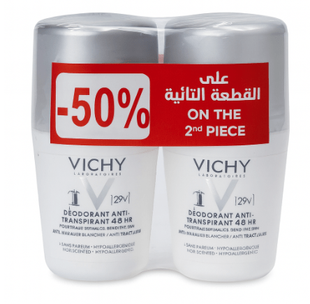 عرض مزيل العرق قطعة والثانية بنصف السعر Offer Vichy Beauty Anti Perspirant 48H Deodorant Roll On 50ml – 2 Pcs Special Price