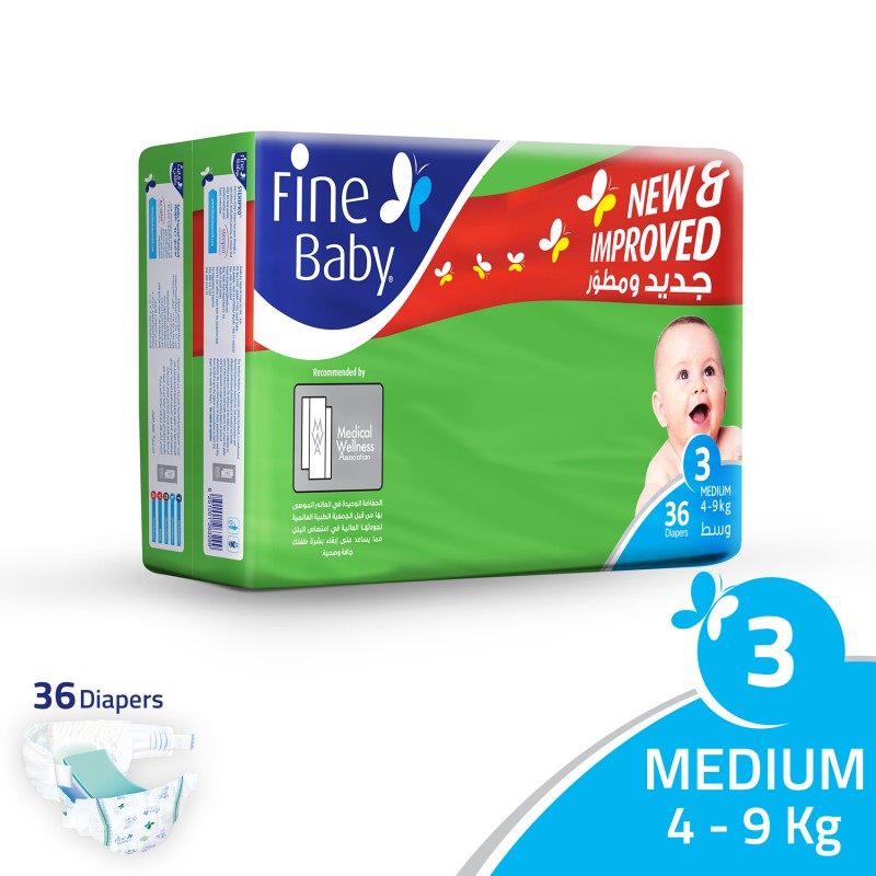 فوط الاطفال Fine Baby Diapers, Size 3, 4-9 Kg, Double Pack, 36 Count