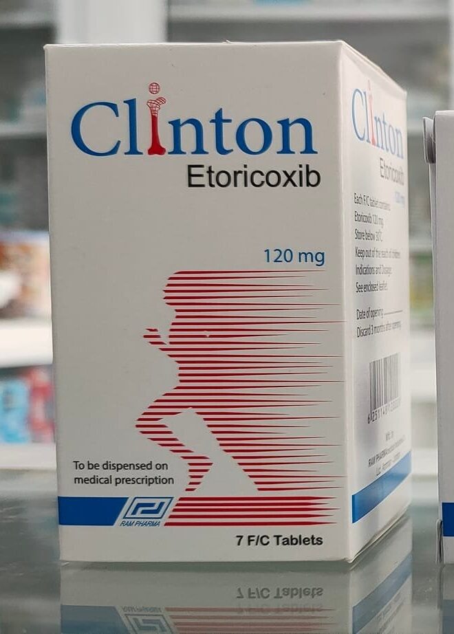 Clinton 120 mg 7 Tablets هو دواء يحتوي على المادة الفعالة Etoricoxib، التي تنتمي إلى فئة مثبطات COX-2 الانتقائية. يُستخدم لتخفيف الألم والالتهاب في الحالات المزمنة والحادة مثل التهاب المفاصل العظمي، التهاب المفاصل الروماتويدي، والتهاب الفقار اللاصق. يتميز الدواء بفعاليته العالية في تقليل الألم مع تأثير أقل على المعدة مقارنة بمضادات الالتهاب التقليدية.