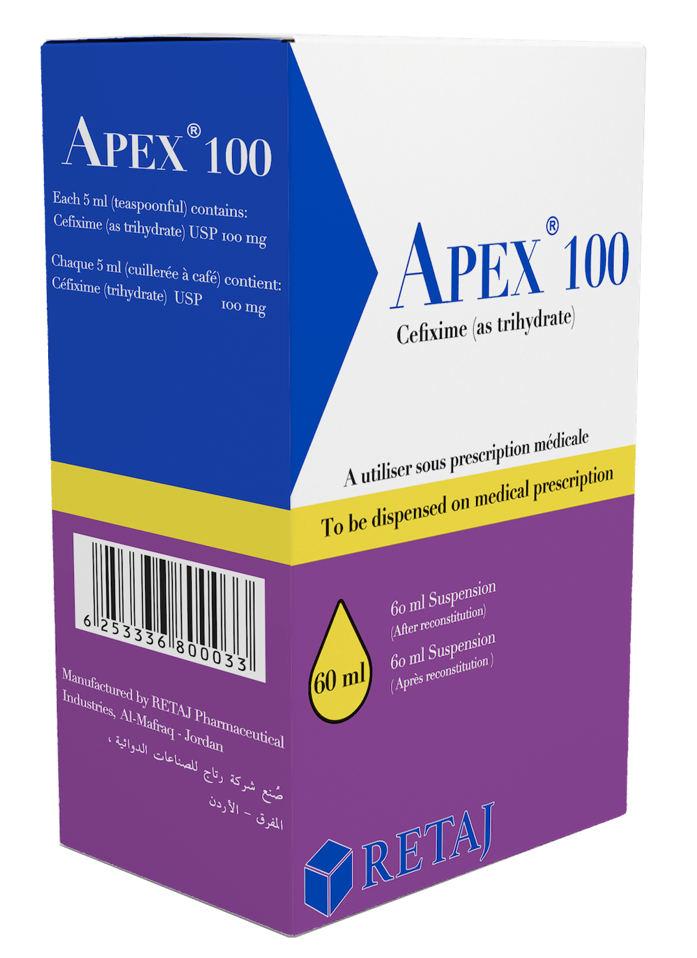 Apex 100mg Syrup 60ml هو مضاد حيوي للأطفال يحتوي على المادة الفعالة Cefixime، وهو من عائلة السيفالوسبورينات الجيل الثالث. يُستخدم لعلاج مجموعة واسعة من الالتهابات البكتيرية التي تصيب الجهاز التنفسي، الأذن، المسالك البولية، والجلد. يتميز بفعاليته العالية وسهولة تناوله.