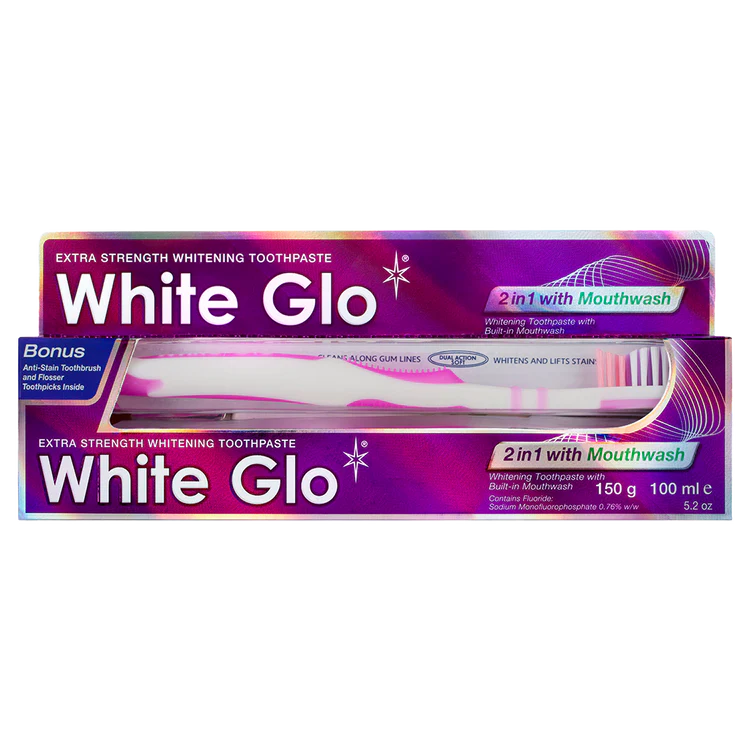 White Glo 2 In 1 Whitening Toothpaste With Mouthwash 150g معجون أسنان مبيض بتركيبة مزدوجة القوة تجمع بين معجون الأسنان وغسول الفم في منتج واحد. يعتمد على تقنية متقدمة وطريقة معالجة حصرية من أجل دعم تبييض مينا الأسنان وتقليل الاصفرار مع الاستخدام المنتظم. بالإضافة إلى ذلك ينتشر غسول الفم المدمج أثناء التفريش ليصل إلى المناطق التي يصعب الوصول إليها، مما يساعد على تعزيز نظافة الفم ومنح انتعاش يدوم لفترة أطول.