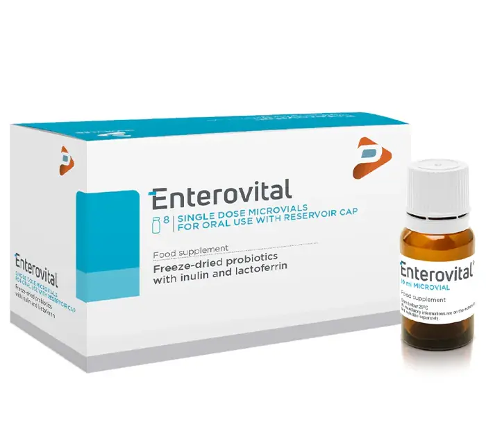 Enterovital 8 Oral Vials هو مكمل غذائي مميز يدعم صحة الجهاز الهضمي من خلال مزيج متوازن من البروبيوتيك، الألياف البريبايوتيكية، واللاكتوفيرين. يساهم هذا المنتج في تعزيز التوازن الطبيعي للبكتيريا النافعة في الأمعاء، مما يحسن الهضم، يُقلل من الانتفاخ، ويُعزز المناعة. بالإضافة إلى ذلك، يتميز بسهولة استخدامه بفضل تصميم القوارير العملية.