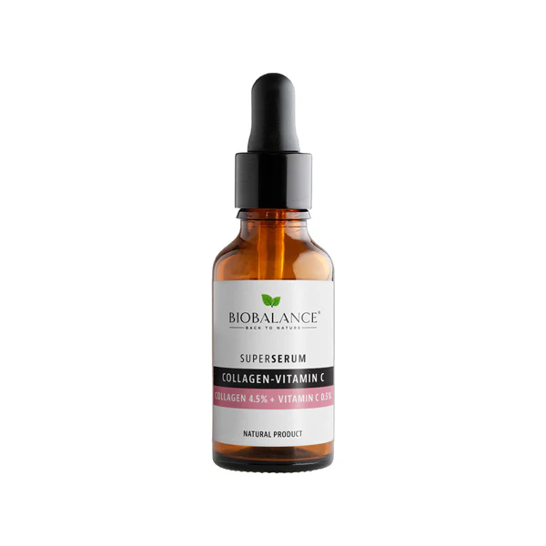 Biobalance Collagen+Vit C Super Serum هو سيروم مبتكر مصمم لتعزيز مرونة البشرة وتقويتها، مع تحسين إشراقتها وتوحيد لونها. هذا السيروم يحتوي على تركيبة فعالة تجمع بين الكولاجين البحري النقي وفيتامين C النقي، مما يساعد في تعزيز إنتاج الكولاجين الطبيعي في البشرة، وبالتالي يقلل من مظهر التجاعيد والخطوط الدقيقة. بالإضافة إلى ذلك، يعمل السيروم على تفتيح البشرة وتقليل التصبغات، مما يمنح البشرة مظهرًا أكثر شبابًا وحيوية. يأتي المنتج بحجم 30 مل، مما يجعله مناسبًا للاستخدام اليومي لجميع أنواع البشرة.