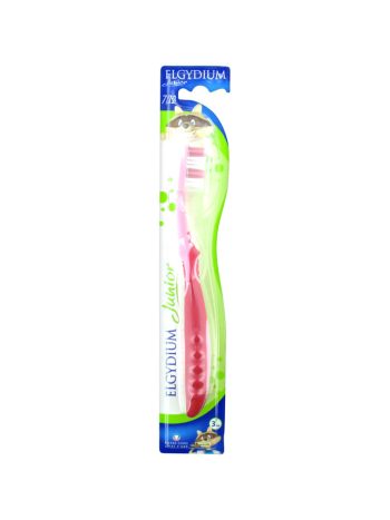 فرشاة الأسنان من الجيديوم للأطفال Elgydium Junior صممت للأطفال من عمر 7-12 سنة شعيرات مناسبة لاسنان الاطفال، تنظف الاسنان بلطف